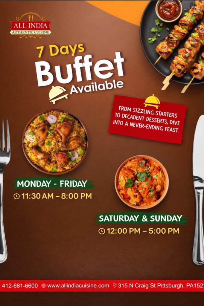 Enjoy an all-you-can-eat Indian buffet available every day of the week.